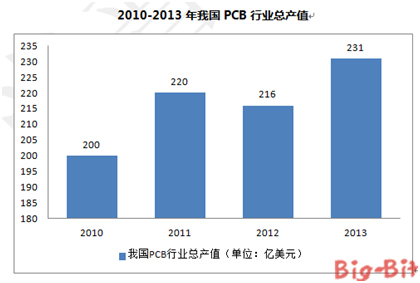 過去十年來,全球PCB持續向亞洲尤其是中國大陸遷移,中國大陸迅速成為電子產品和PCB生產大國。中國因內需市場潛力與生產制造優勢,吸引外資紛紛進駐,促使中國大陸PCB產業在短短數年內以倍數成長,行業總產值從2000年的33.68億美元到2012年的216.36億美元,已發展成為全球最大的PCB生產國家。據預測,未來幾年中國PCB行業仍保持快速增長趨勢,在全球的市場地位也將繼續提升;2012年至2017年中國PCB產值年復合增長率可達6.0%,到2017年總產值可達到289.72億美元,占全球PCB總產值比例上升至44.13%。