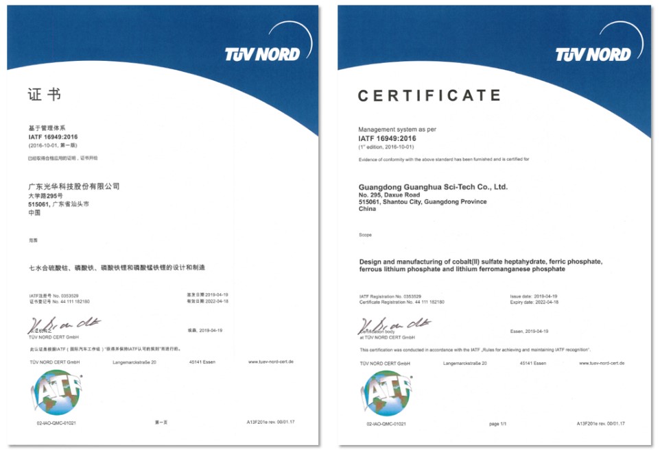 目前,經過不懈努力,公司的七水合硫酸鈷、磷酸鐵、磷酸鐵鋰和磷酸錳鐵鋰近日順利通過了IATF16949:2016認證,這意味著上述產品的設計及制造達到汽車行業質量管理的先進水平,產品品質更加穩定可靠。